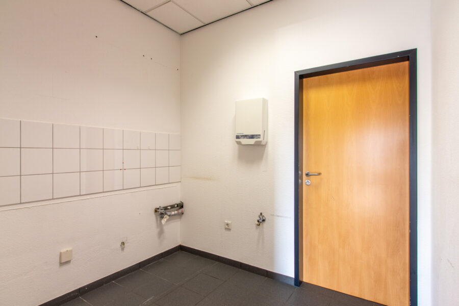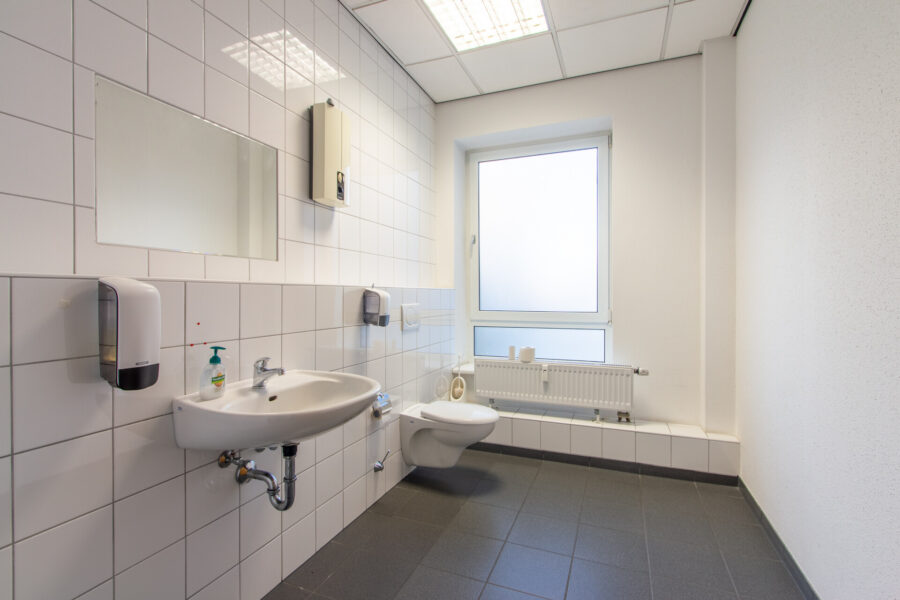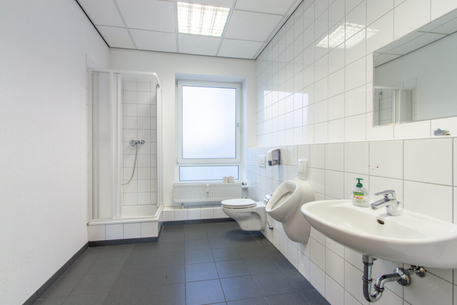 Die Bürofläche verfügt über ein Damen-WC mit WC und Waschbecken sowie ein Herren-WC mit WC, Pissoir, Dusche und Waschbecken.