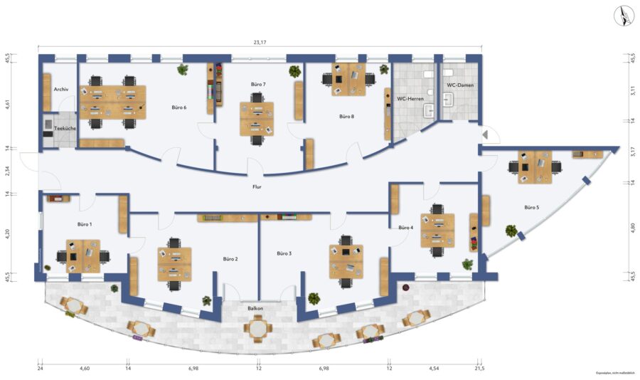 acht Büroräume, Küche, Archiv, Damen-WC, Herren-WC, Flur, Balkon.