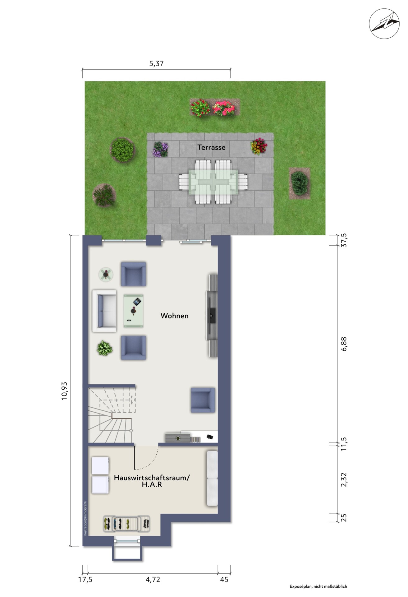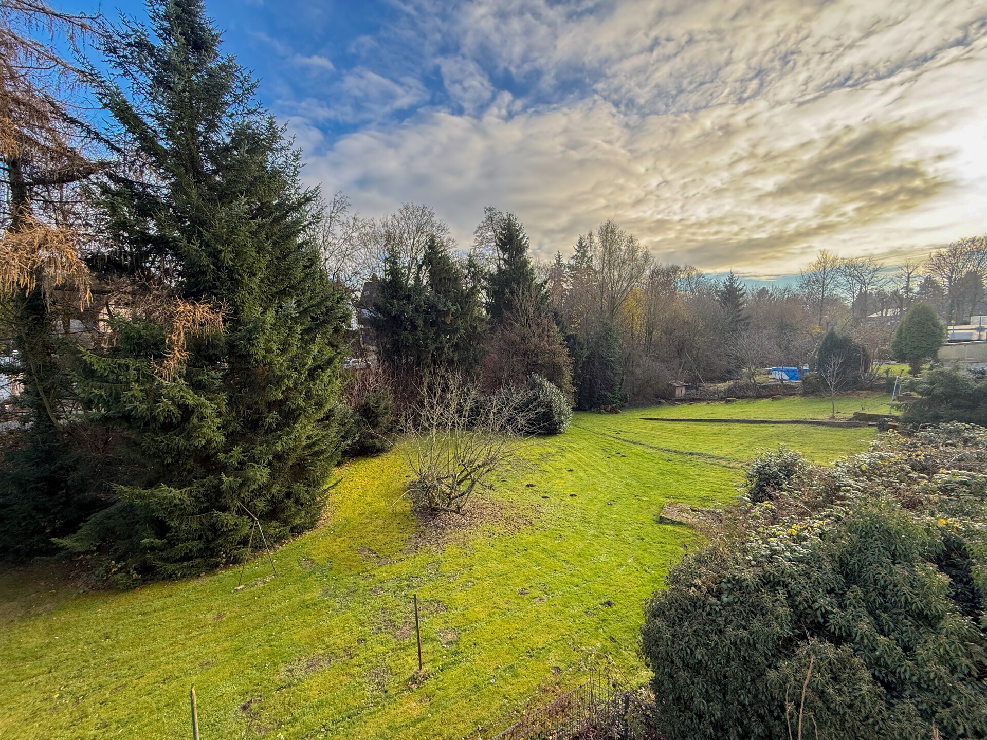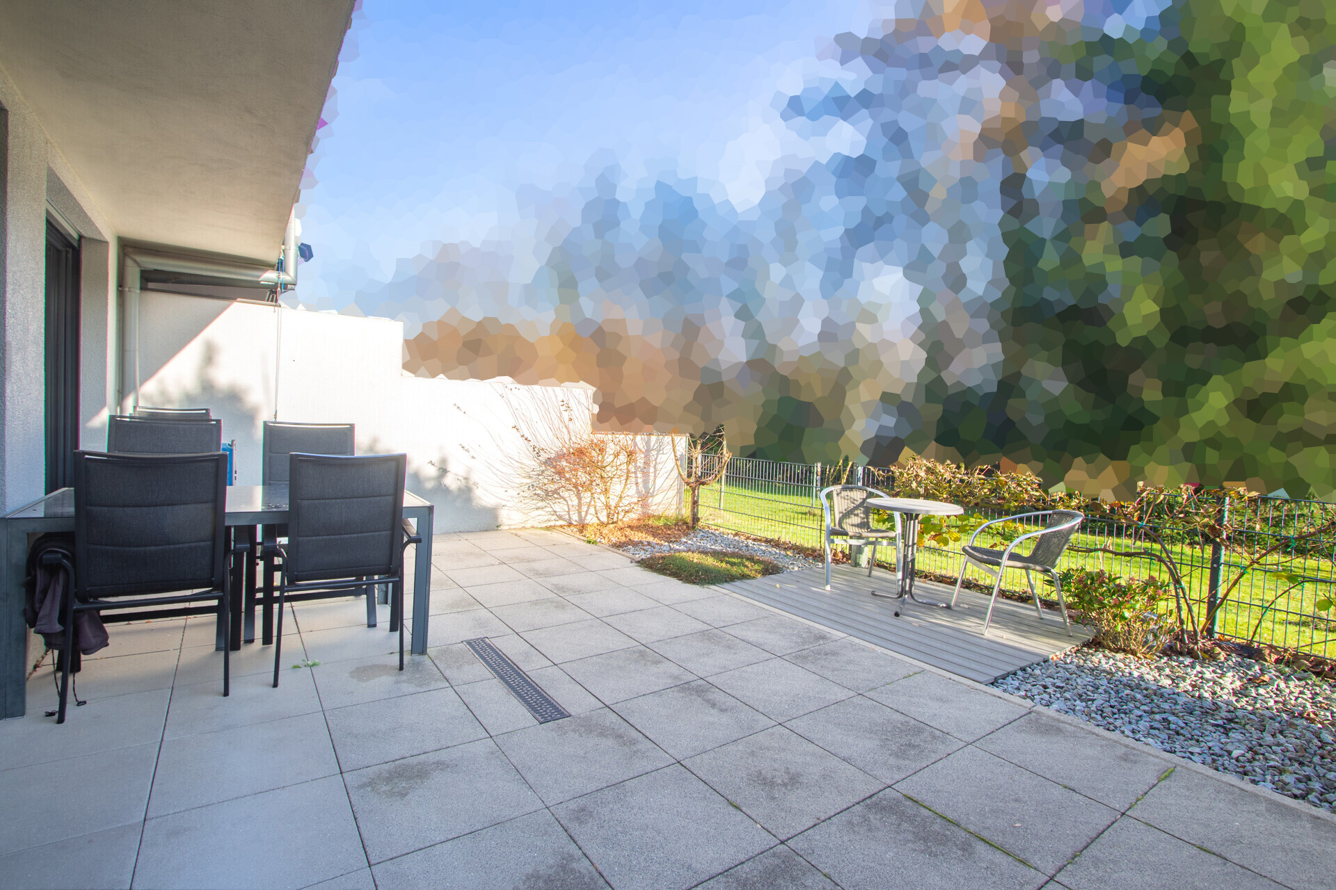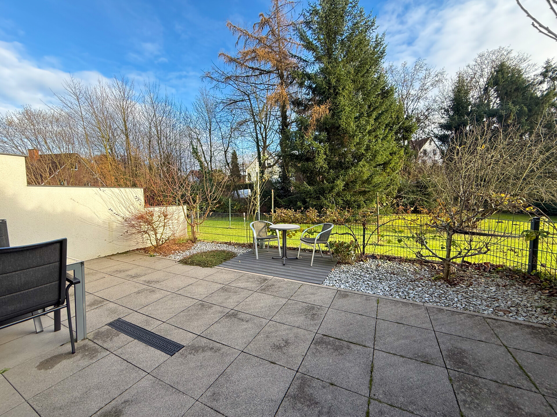 Durch die Hanglage verfügt das Haus zusätzlich über ein lichtdurchflutetes Gartengeschoss mit direktem Zugang zur Terrasse – ein seltenes Highlight in dieser Lage. Die großzügige Terrasse bietet viel Platz für eine gemütliche Außengestaltung. Direkt angrenzend befindet sich eine weitläufige Grünfläche, die für einen freien Blick ins Grüne und eine angenehm offene Atmosphäre sorgt, ohne direkte Bebauung in unmittelbarer Nähe.