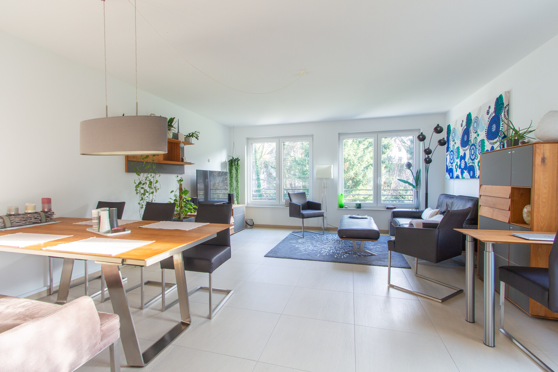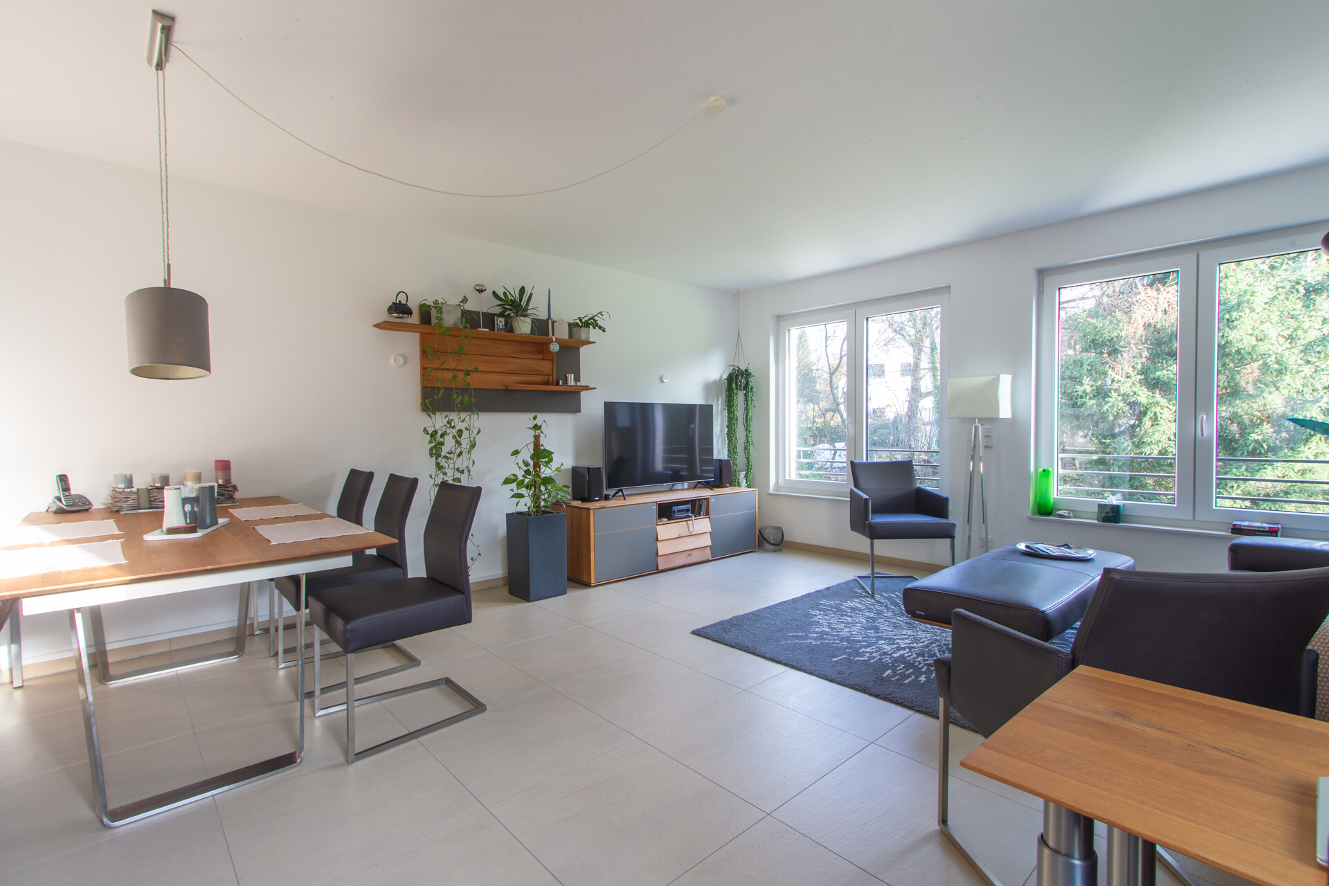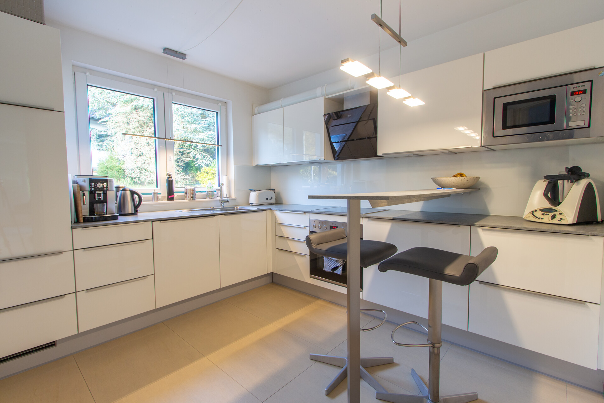 Das Haus wurde nach dem strengen KfW-40-Standard errichtet und erfüllt damit deutlich höhere Anforderungen an Energieeffizienz als vergleichbare Neubauten. Die Kombination aus Erdwärmepumpe, dreifach verglasten Fenstern, elektrischen Rollläden sowie der durchgehenden Fußbodenheizung sorgt für ein ganzjährig angenehmes Wohnklima bei gleichzeitig niedrigen Heizkosten.