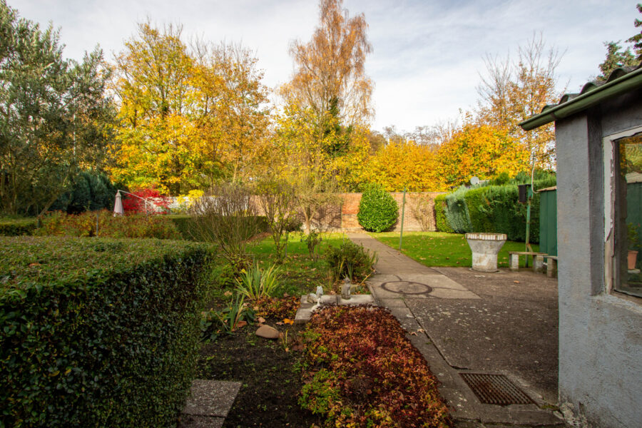 Der Garten bietet neben der großen Rasenfläche einen Abstellplatz für Mülltonnen, einen praktischen Geräteschuppen, der zusätzlichen Stauraum schafft und eine überdachte Sitzgelegenheit.