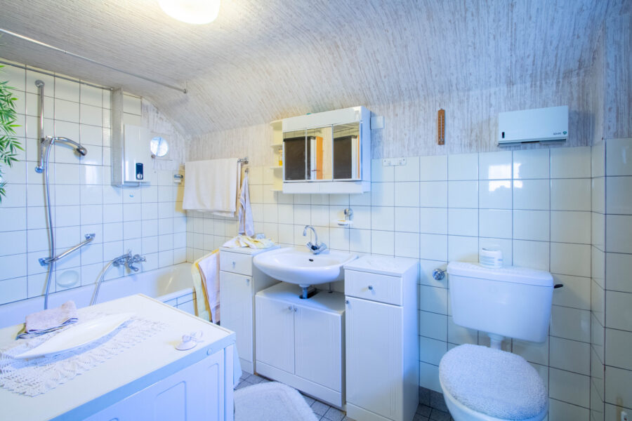 Badezimmer mit Badewanne, WC, Waschbecken, Fenster und Waschmaschinenanschluss.