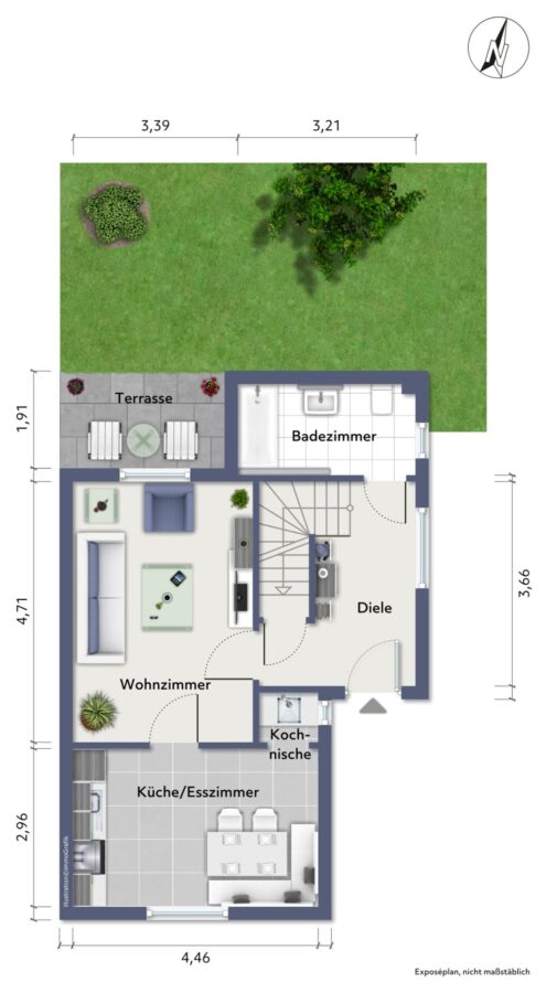 Erdgeschoss: Wohnzimmer, Küche, Badezimmer, Diele und Garten.