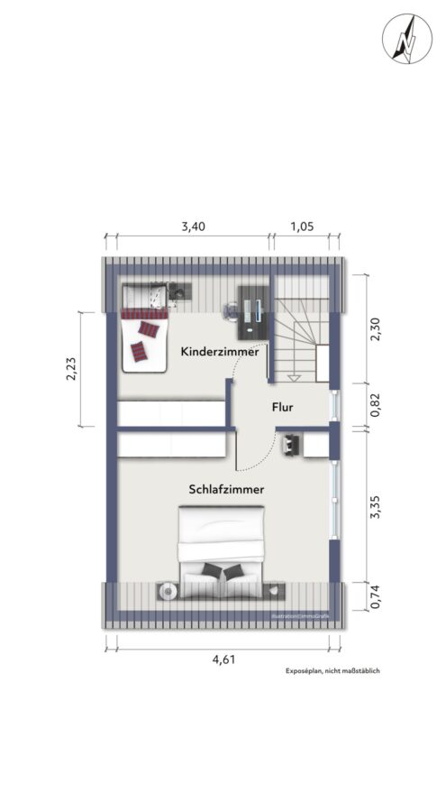Obergeschoss: Schlafzimmer und Kinderzimmer.