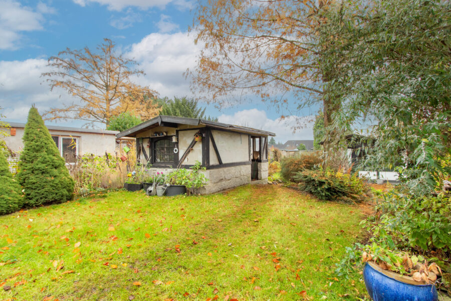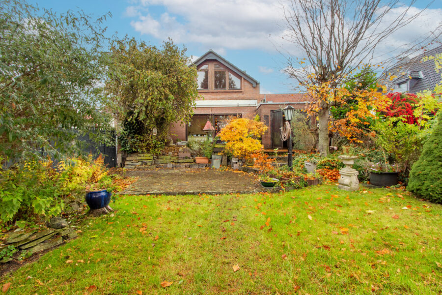 Der großzügige Garten verfügt über eine höher gelegene Terrasse, zwei Gartenhäuser und einen kleinen Teich, der zu erholsamen Stunden einlädt.