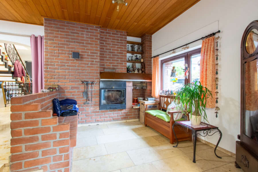 Küche, Kamin- und Esszimmer, Wohnzimmer, Diele, Terrasse und Garten.