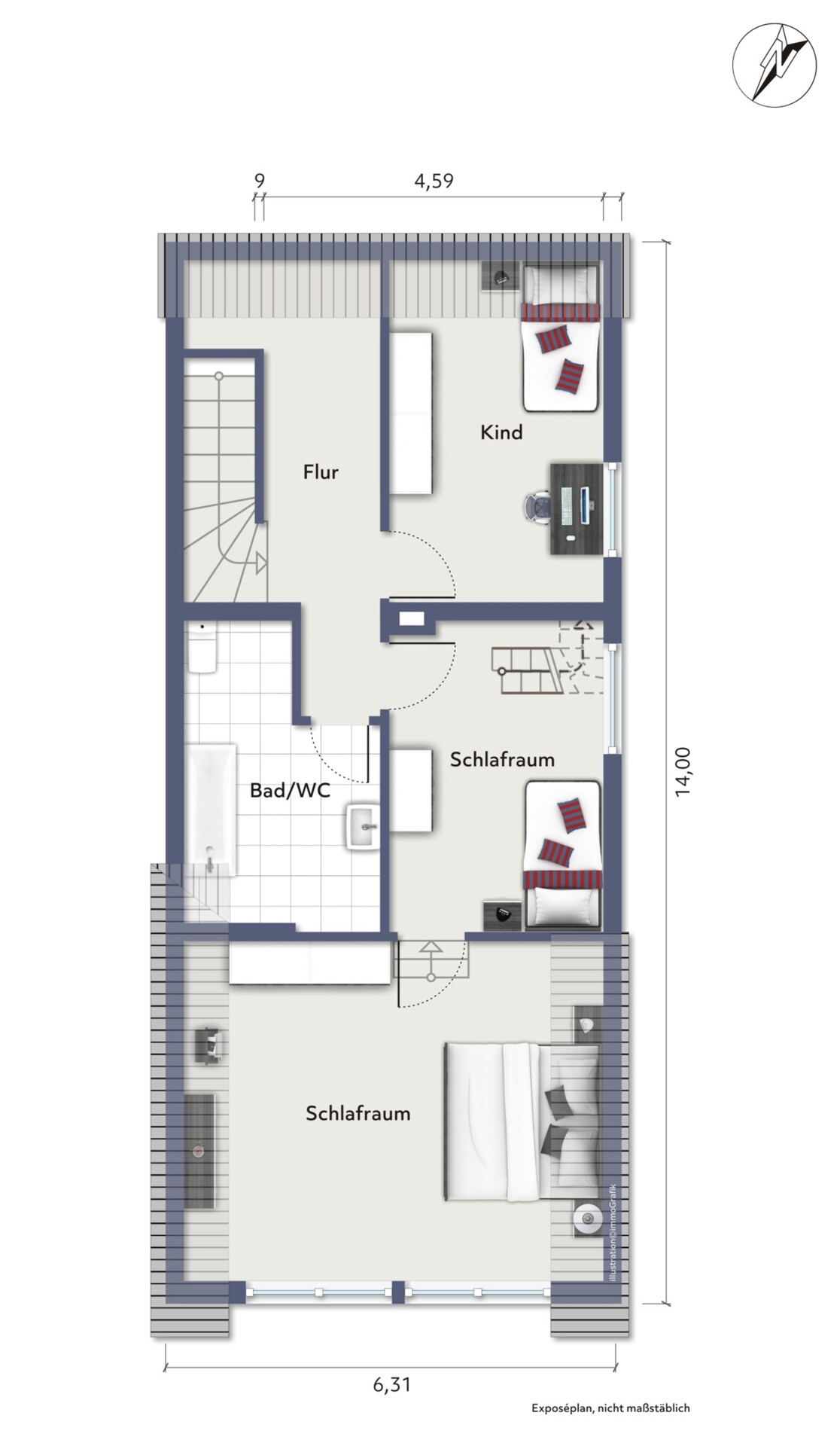 Schlafzimmer, zwei Kinderzimmer, Badezimmer und Flur.