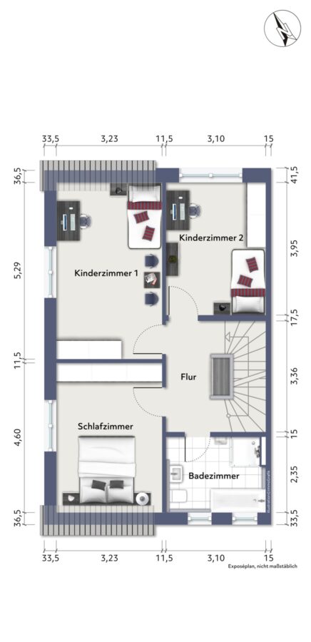 Obergeschoss: Schlafzimmer, Kinderzimmer, Kinderzimmer II, Flur, Badezimmer.