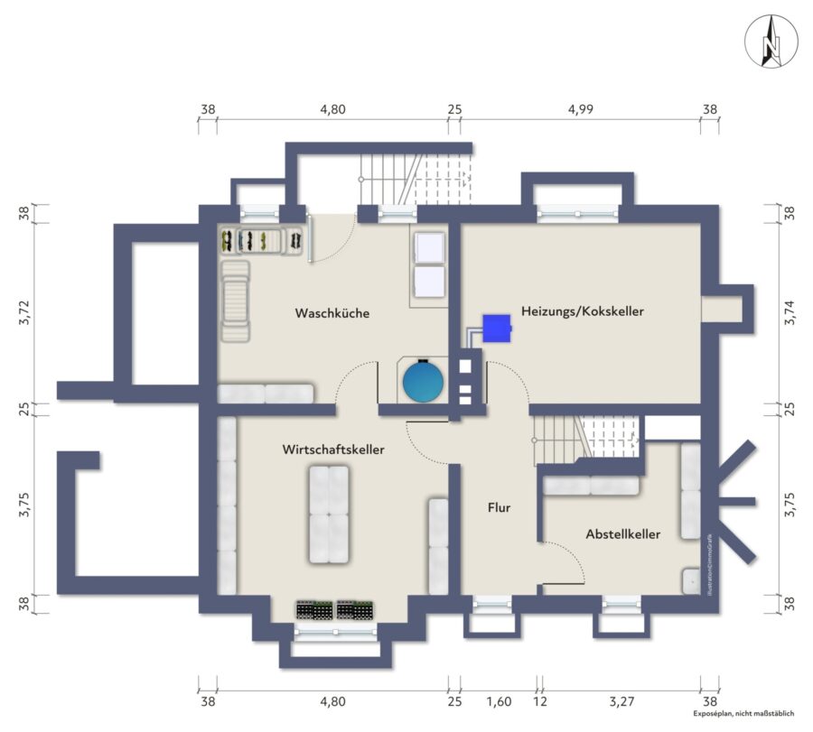Kellergeschoss: Heizungskeller, Abstellraum, Waschkeller, Werkskeller, Flur.
