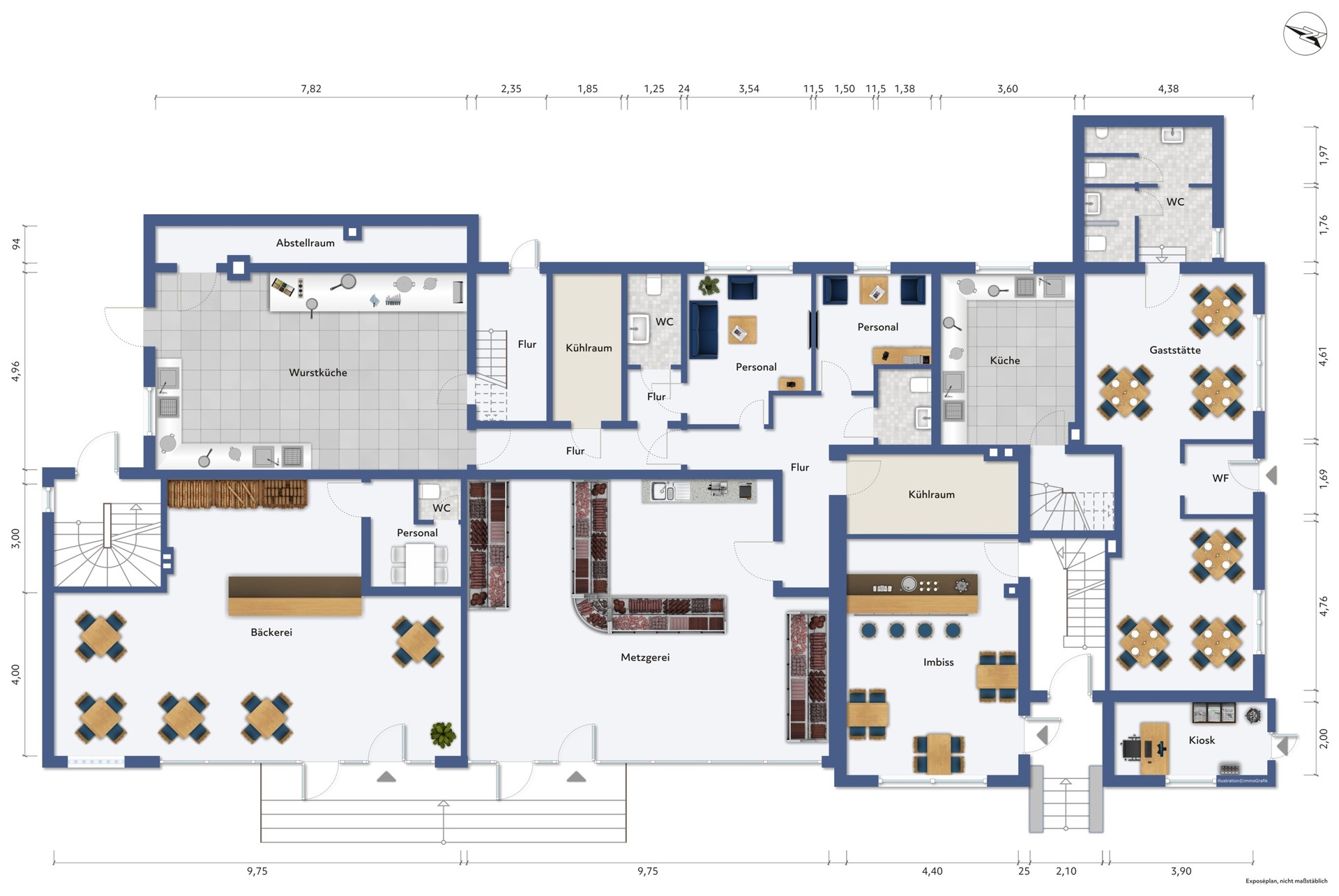 Sie besteht aus einem großen Verkaufsraum, zwei Kühlräumen, zwei Personalküchen, zwei WCs, einer Räucherkammer, einer Wurstküche und einem Flur.