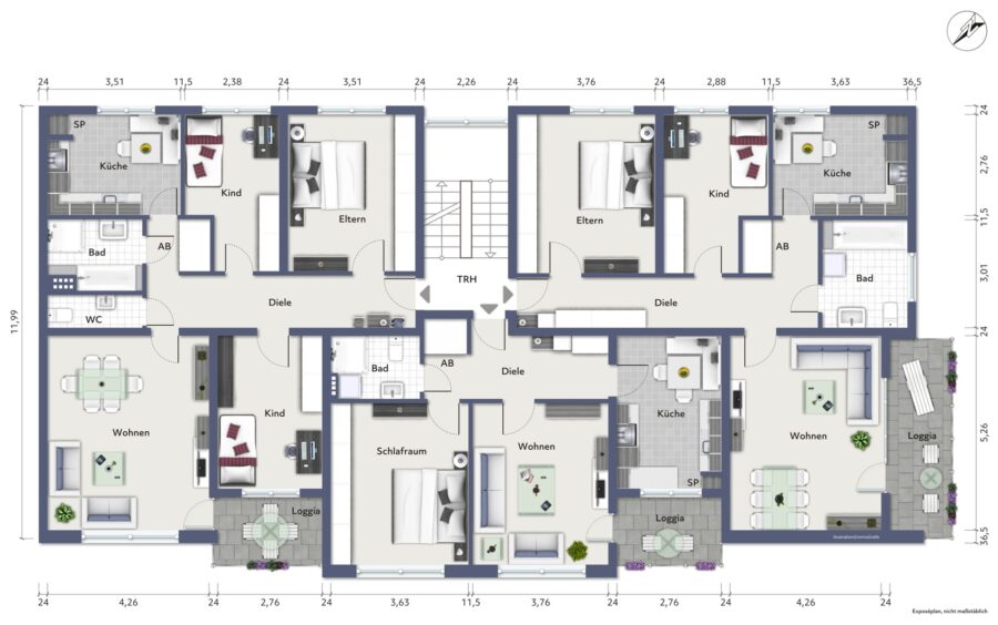 Die Wohnungen mitte und rechts haben innenliegende Bäder.