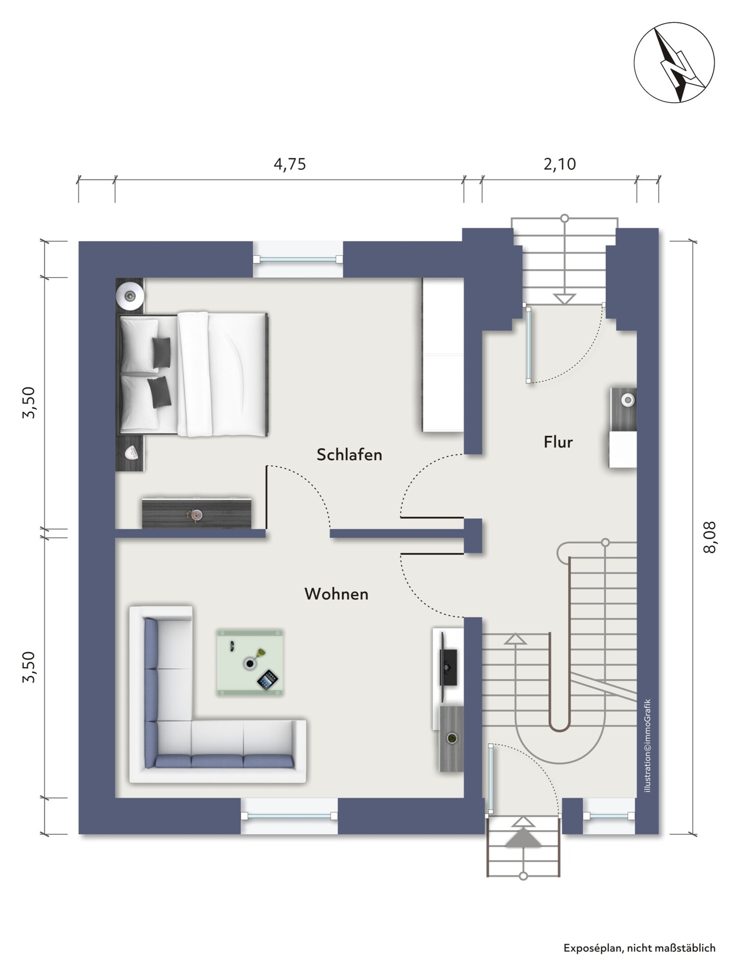 Erdgeschoss: Wohnzimmer, Schlafzimmer, kleines Gäste-WC, Diele.