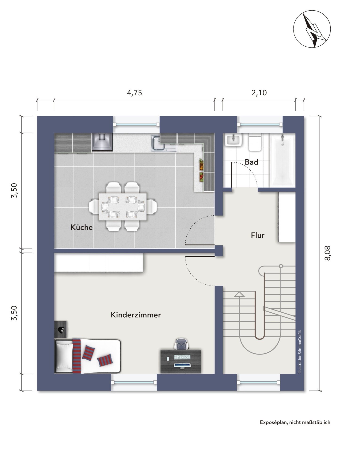 Obergeschoss: Kinderzimmer, Küche, Badezimmer, Flur.