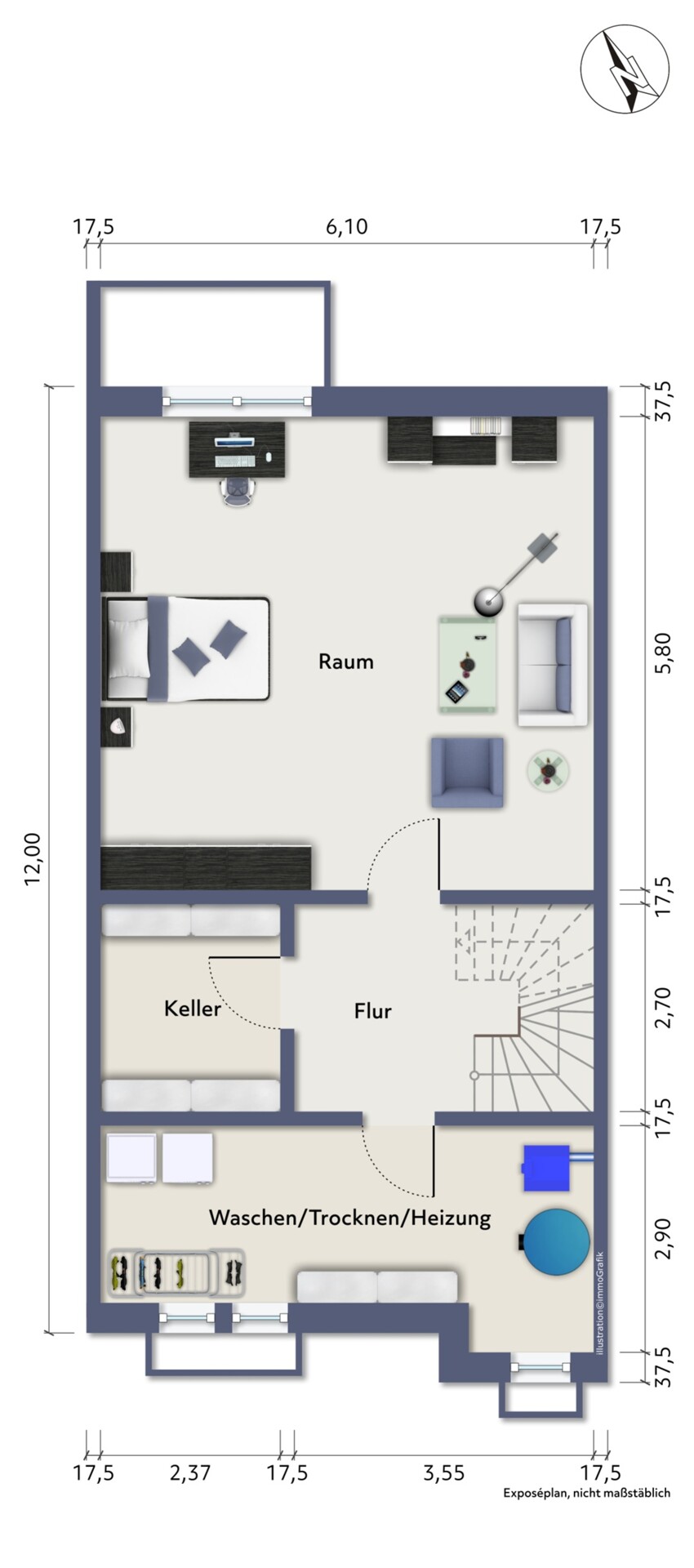 Kellergeschoss: Hobbyraum, Hausanschlussraum, Lagerkeller, Flur.