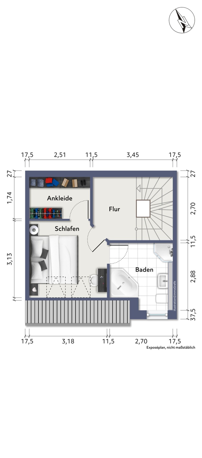 Obergeschoss: Schlafzimmer, Badezimmer, Ankleidezimmer, Flur.