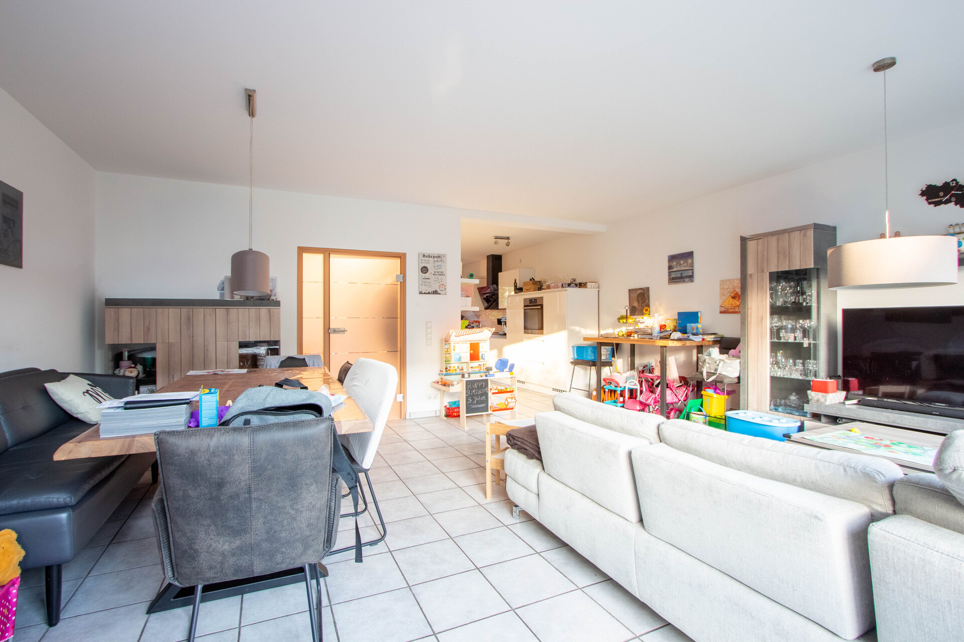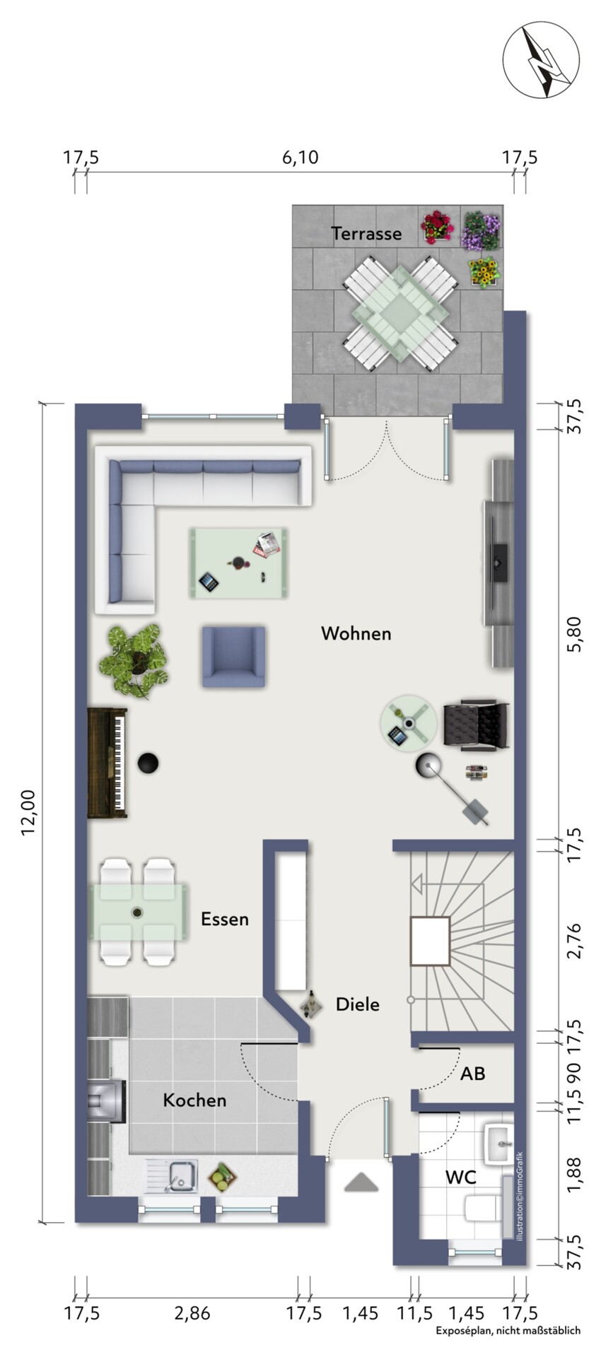 Erdgeschoss: offener Wohn-Essbereich mit direktem Zugang zum Garten, Gäste-WC, Abstellraum, Diele.