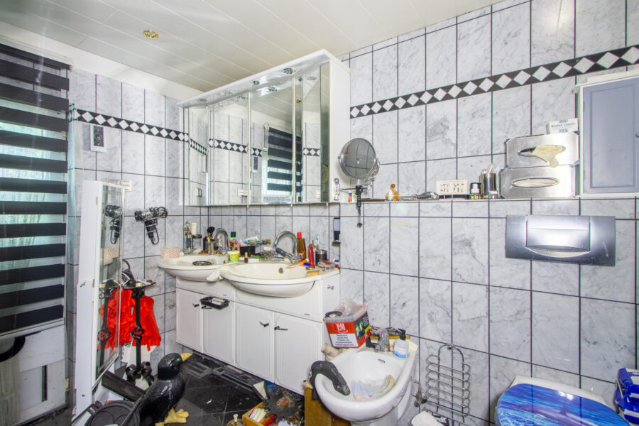 Bodenfliesen in schwarz, Wandfliesen in hellgrau, Sanitäranlagen in weiß.
