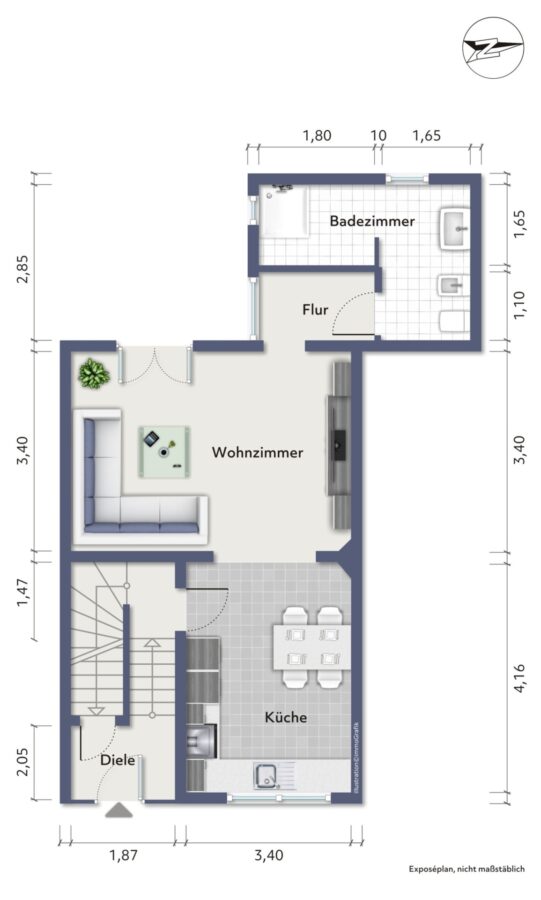 Erdgeschoss: Wohnzimmer, Küche, Badezimmer, Flur, Diele.
