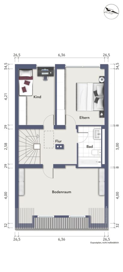 Obergeschoss: Schlafzimmer, Kinderzimmer, Hobbyraum, Badezimmer.