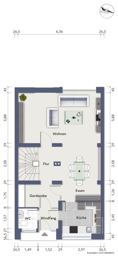 Erdgeschoss: Wohn/Esszimmer, Küche, Gäste-WC, Flur, Diele.