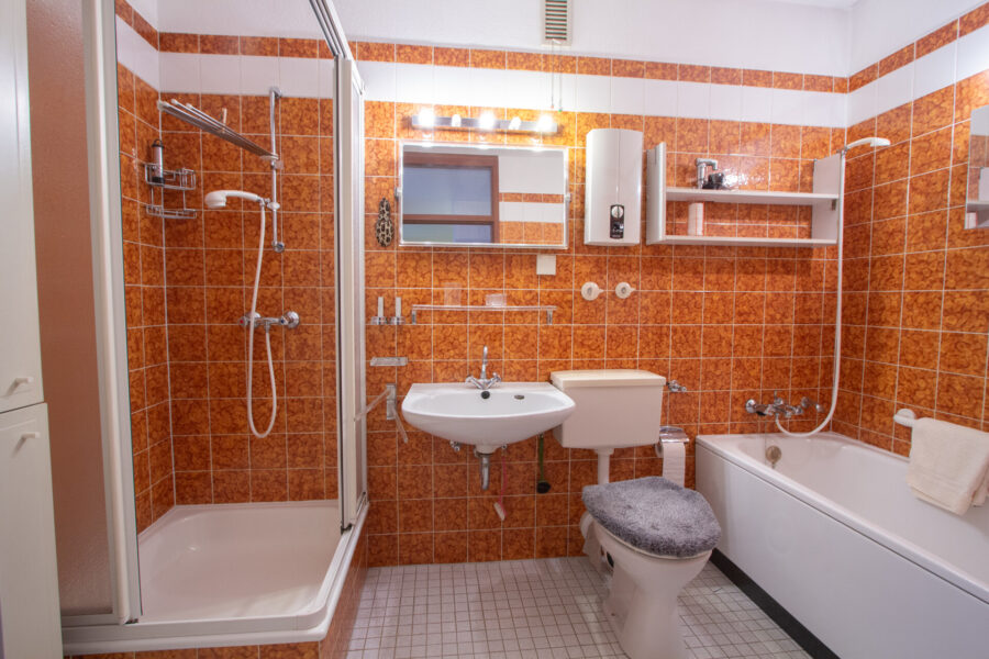 Badezimmer: mit Dusche, Badewanne, WC, Waschbecken.