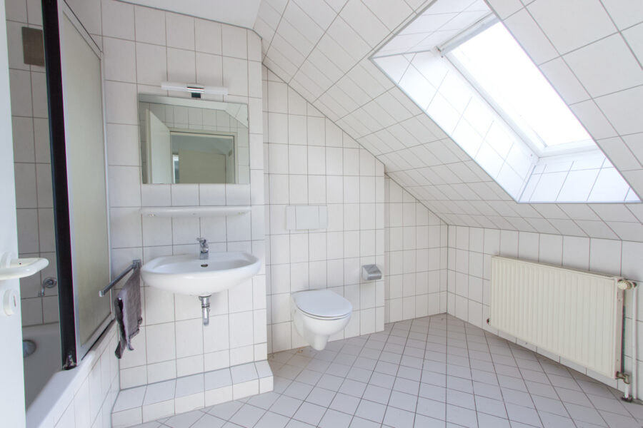 Bad mit Badewanne, Dusche, Fenster, WC und Waschbecken. Sanitärfarbe: weiß, Wand- und Bodenfliesen: weiß.