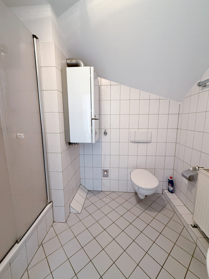 Bad mit Dusche, WC und Waschbecken. Sanitärfarbe: weiß, Wand- und Bodenfliesen: weiß.