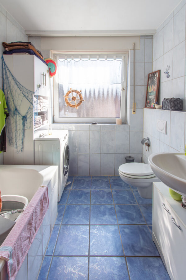 Badezimmer mit Duschwanne, WC, Waschbecken und Fenster. Sanitärfarbe: weiß, Bodenfliesen: blau.