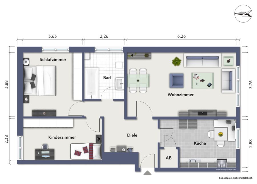Wohnzimmer, Schlafzimmer, Kinderzimmer, Küche, Badezimmer, Diele, Abstellraum.