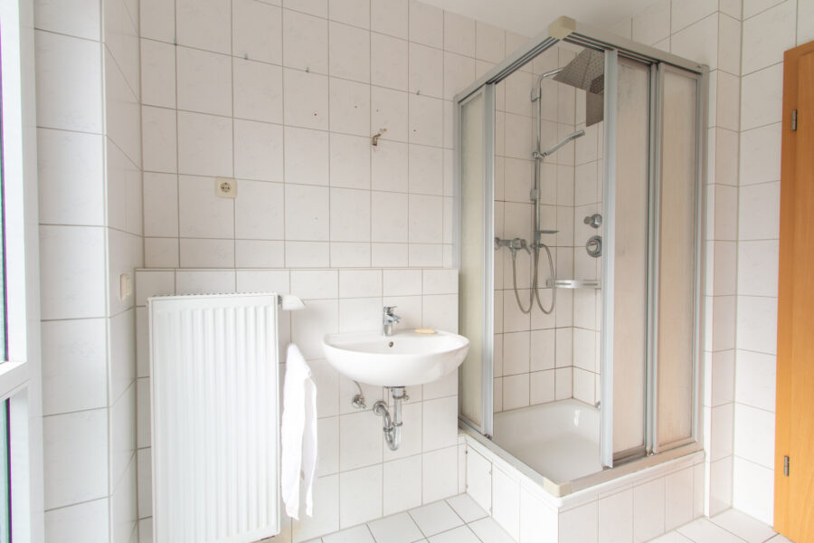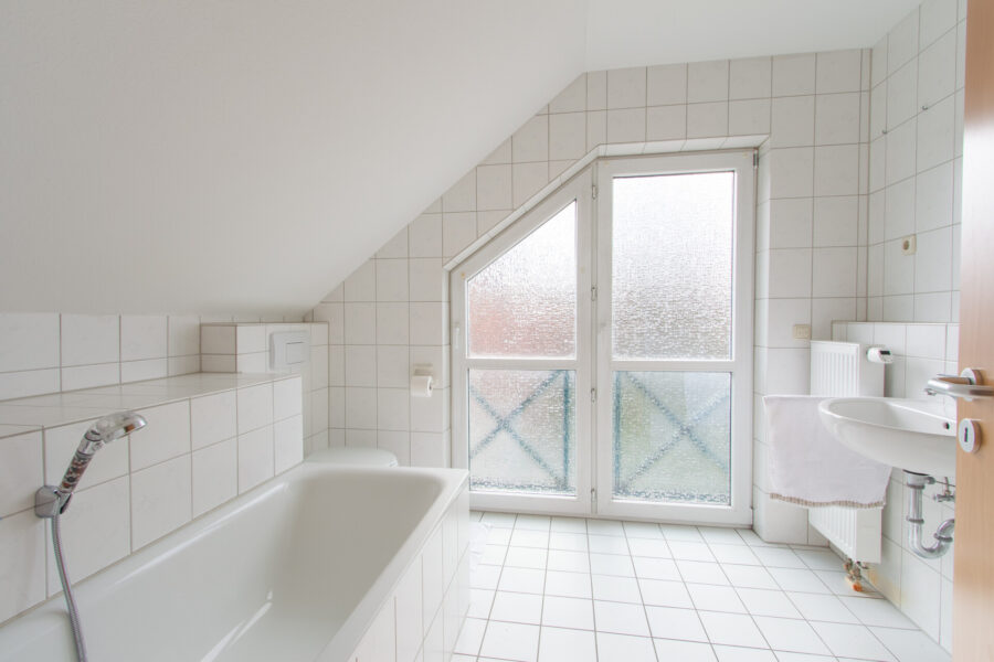 Badezimmer: mit Dusche, Badewanne, Waschbecken, WC, Fenster, Sanitär und Fliesen weiß.