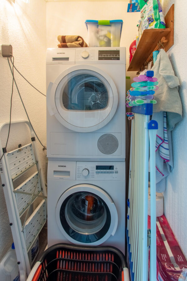 Zur Wohnung gehört ein privater Kellerraum. Der Waschmaschinenstellplatz ist in der Wohnung. Alternativ kann aber auch der Wasch- und Trockenraum im Keller genutzt werden.