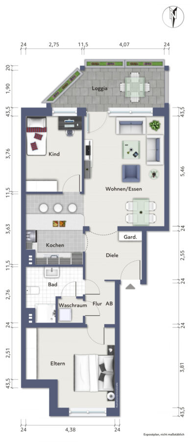 Wohnzimmer mit offener Küche, Schlafzimmer, Büro, Badezimmer, Waschraum, Abstellraum, Diele, Flur, Loggia.