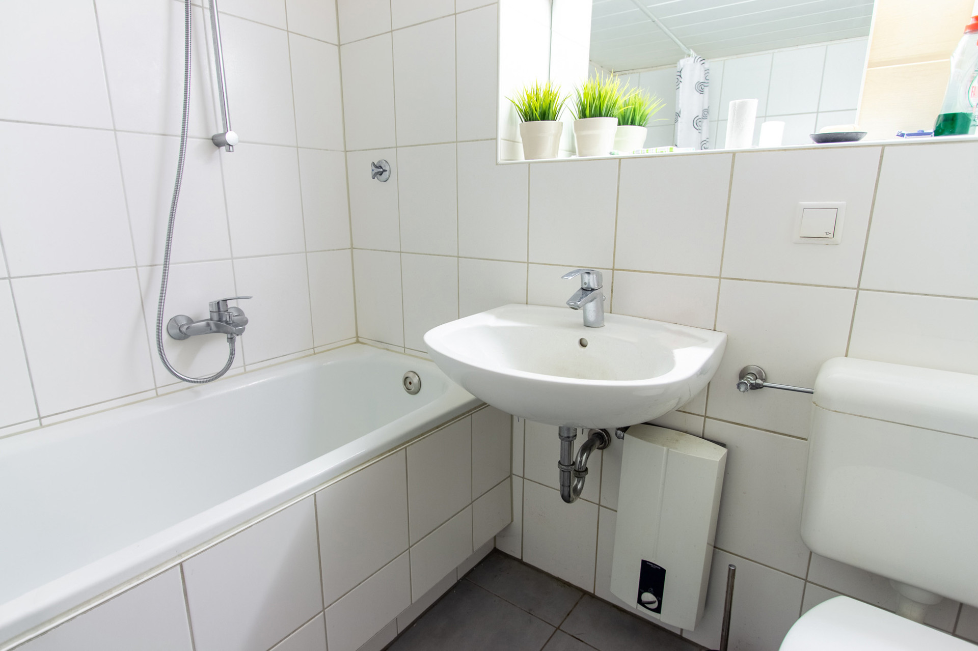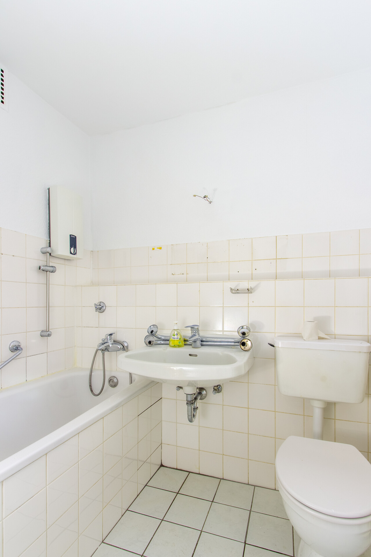 Badezimmer mit Badewanne, Waschbecken, WC, Sanitär weiß.