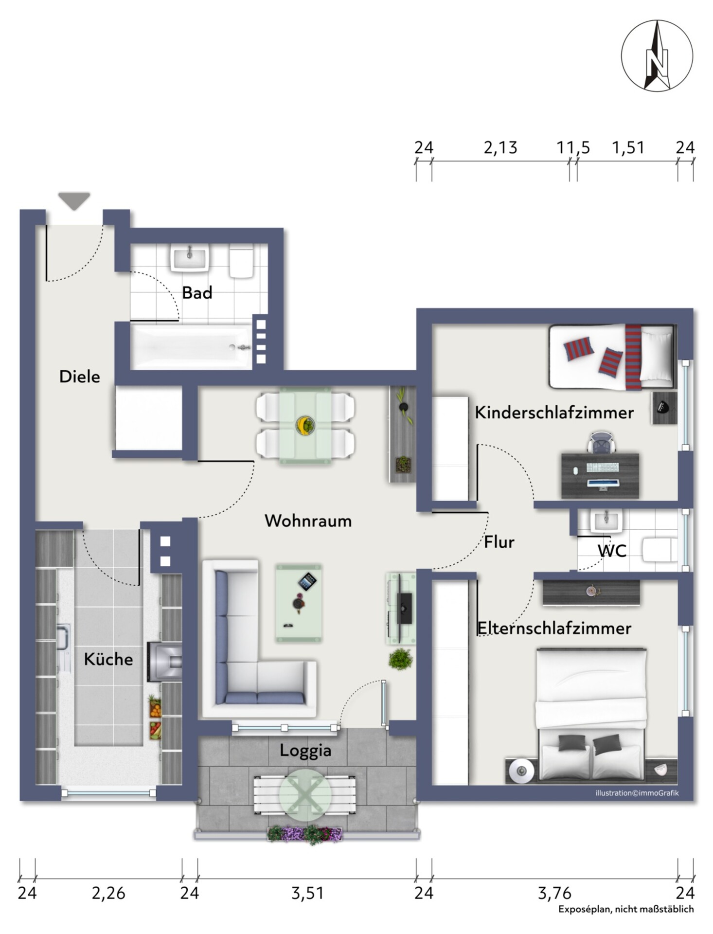Wohnzimmer, Schlafzimmer, Kinderzimmer, Küche, Badezimmer, WC, Loggia, Flur, Diele.