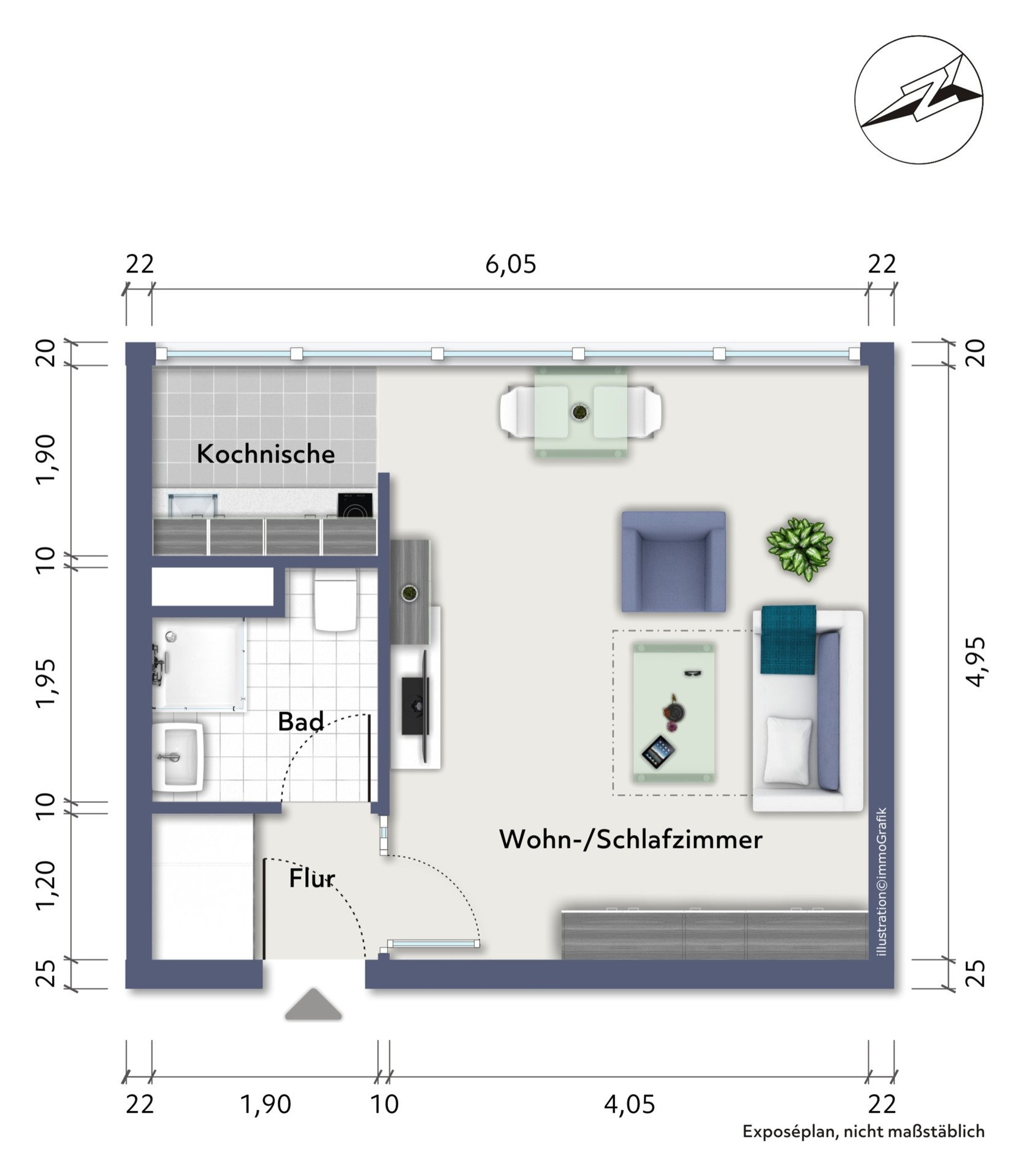 Wohn-/Schlafbereich, Kochnische, Badezimmer und Diele.