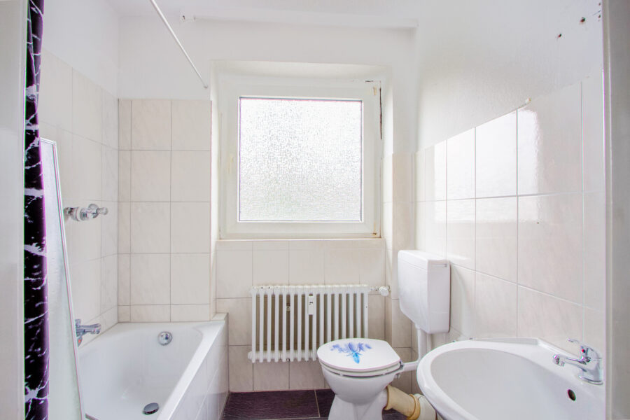 Sanitär und Wandfliesen in weiß. Bodenfliesen in grau.