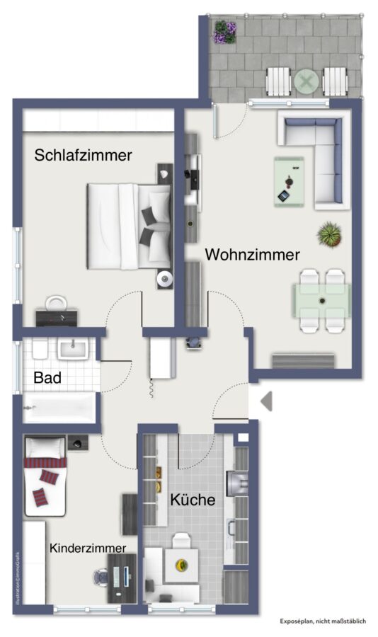 Wohnzimmer, Schlafzimmer, Kinderzimmer, Küche, Badezimmer, Diele und Balkon.