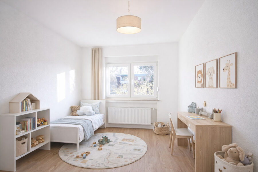 Wohnzimmer, Schlafzimmer, Kinderzimmer, Küche, Badezimmer, Diele und Balkon.