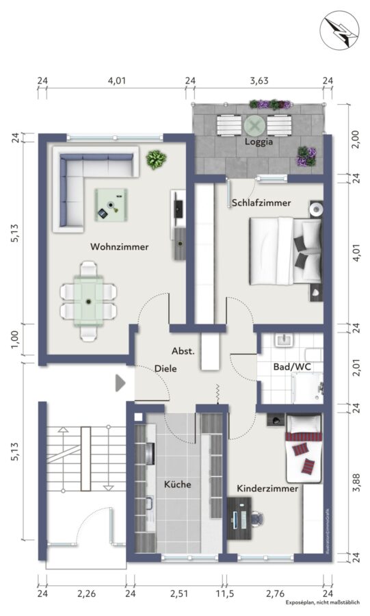 Bei den möblierten Räumen handelt es sich um Einrichtungsbeispiele. Die Wohnung wird unmöbliert übergeben.