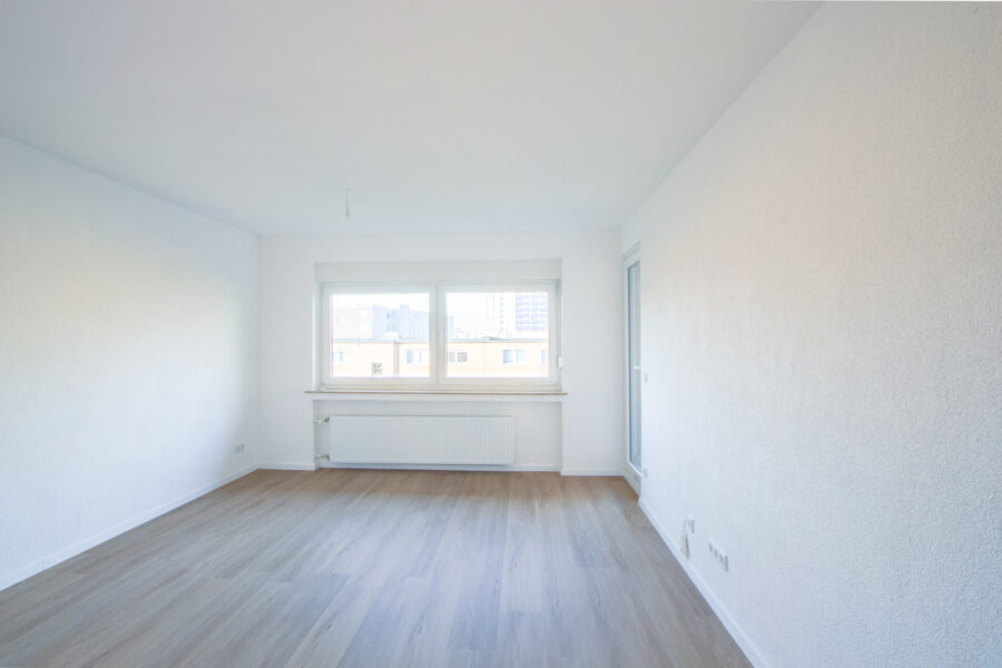 Der einheitliche, helle Laminatboden in den Wohnräumen sowie weiße Türen und Zargen unterstreichen den modernen Gesamteindruck der Wohnung.