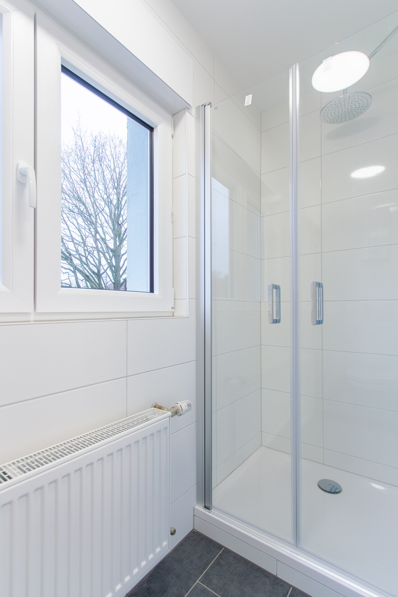 Bodenfliesen in Anthrazit, Wandfliesen in Weiß, Sanitäranlagen in Weiß.