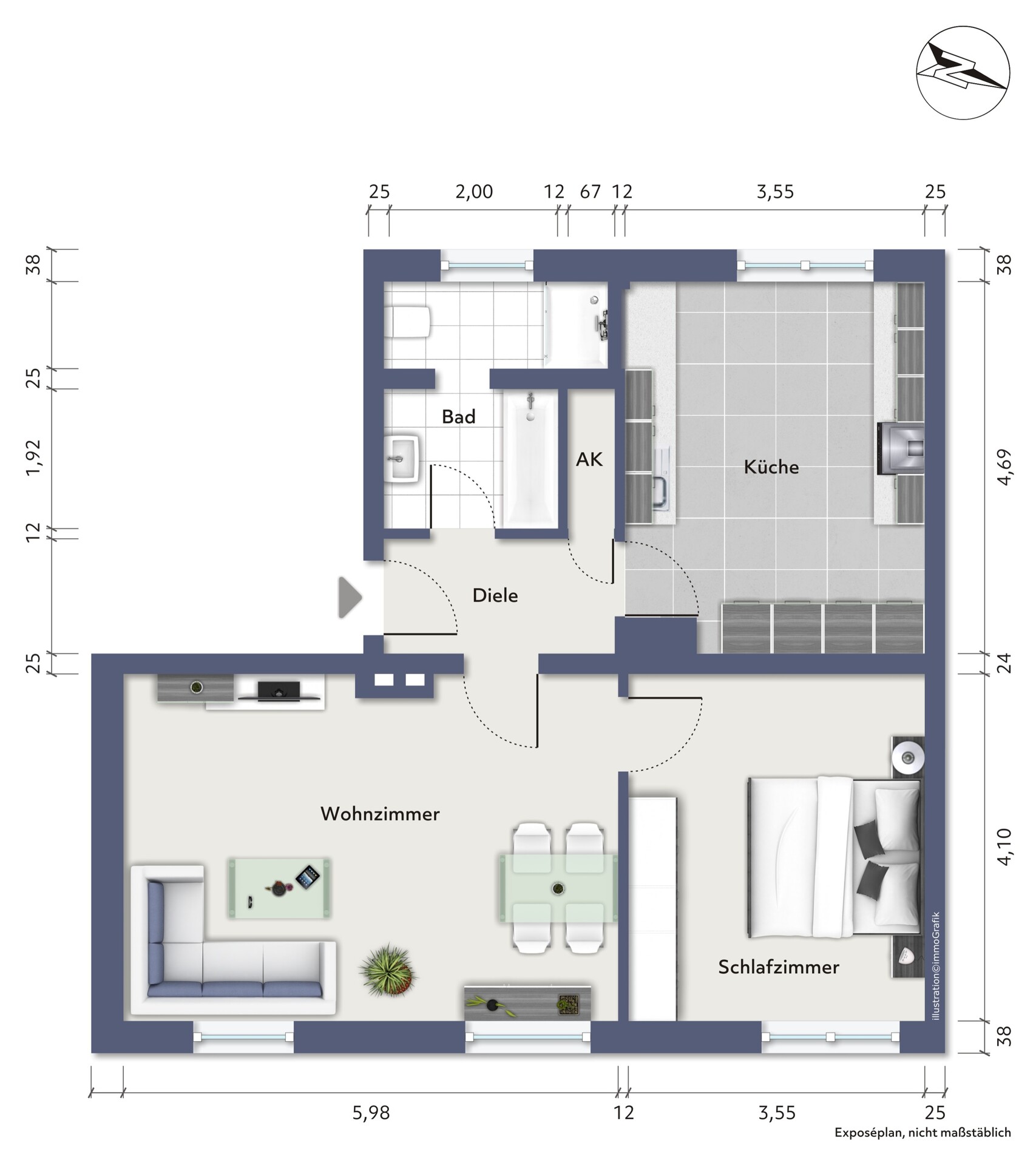 Wohnzimmer, Schlafzimmer, Küche, Badezimmer, Abstellraum, Diele.