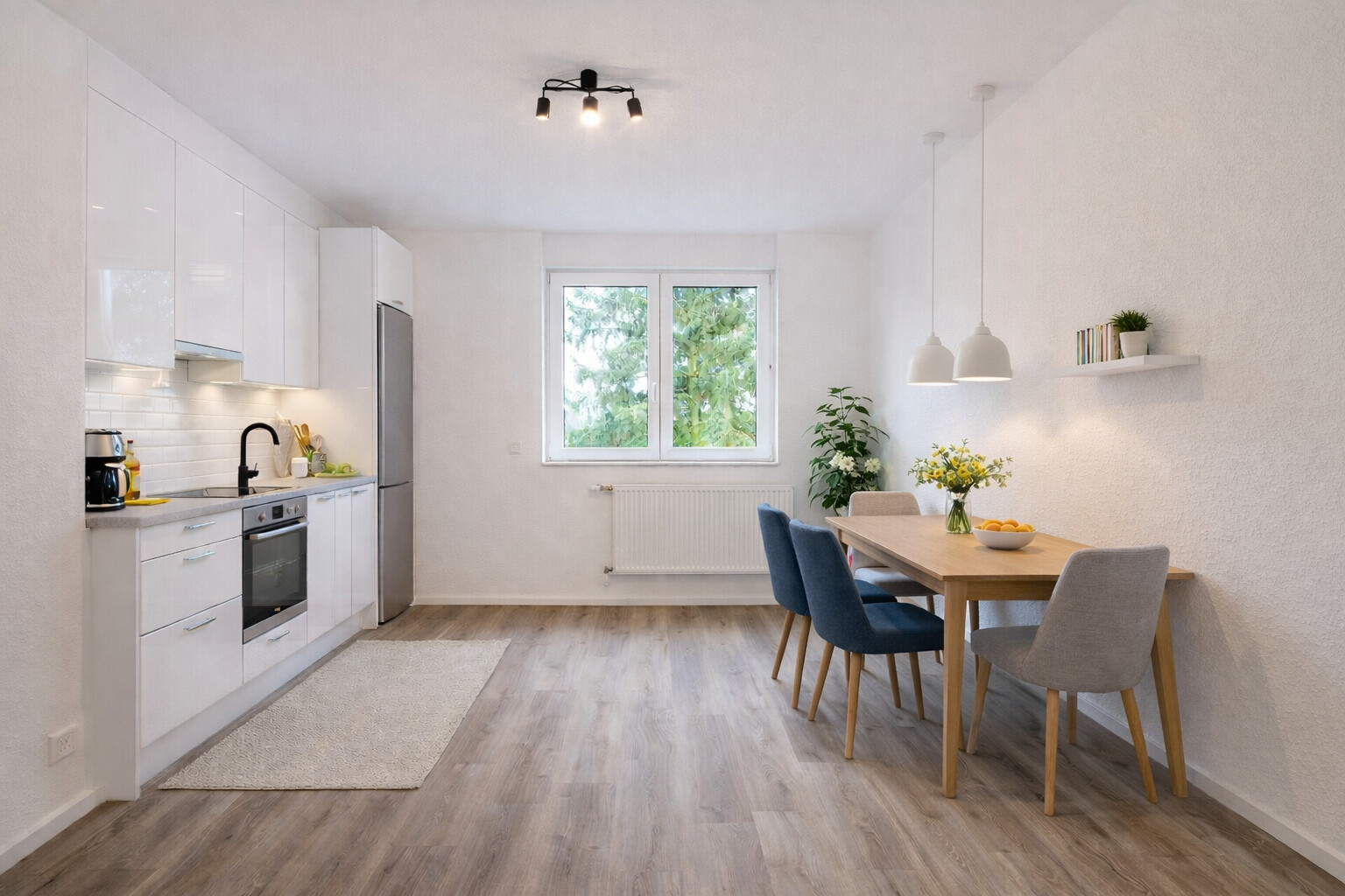 Fliesen in Anthrazit im Badezimmer, Vinyl in den übrigen Räumen.